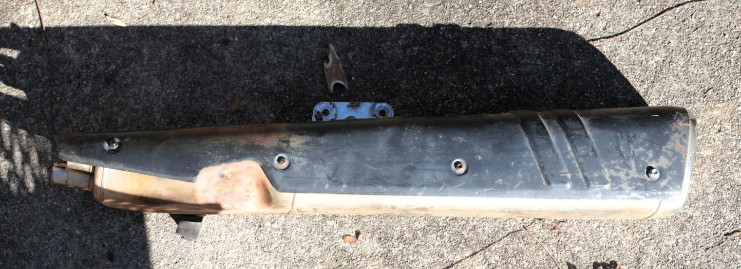 K100 2V header & muffler with heat shield in fair condition. This came from an early 1985 bike. It has the 2 hole hanger bracket used on the earlier bikes. Ugly but usable.