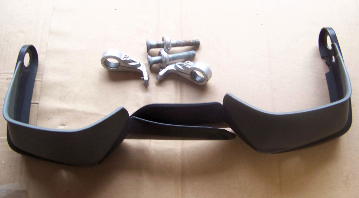 Good condition set of left and right hand guards, newer style, for all R1200GS bikes from 2005-2012. These were stock on 08-2012 bikes. Handlebar mounting clamps are included along with the end bolts, and spacers. One guard has a small notch cut out of it on the underside as shown in the inset pic. BMW gets over $300 for these parts new.