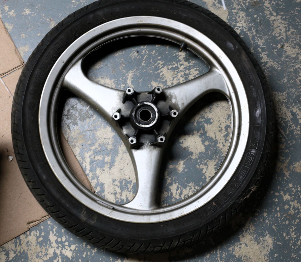 Silver 3-Spoke front wheel for K1100LT bikes only. This wheel takes the newer style floating rotors and can not be used on K75/100 2V bikes due to different rotor bolt hole spacing. It is in good shape with some paint fading/staining and minor scratches, straight and ready to mount. Has a Metzeler Lazer Tec tire with 50% of tread remaining.