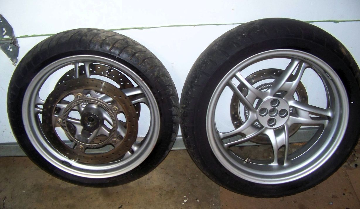 Good condition set of front & rear 5 spoke wheels for all R1150RT/RS/R bikes. The rear is the standard 5.0X 17 size rim. Front and rear rotors are included and the rotors measure 4.87mm front and rear (5.0mm is new spec). Also included are the ABS rings. Tires are worn but will be left on to protect the rims during shipment. These wheels are in decent cosmetic shape and would cost approx $3000 to duplicate, save big here! Perfect for having an extra set of wheels for tire changes or putting 17" wheels on your GS.