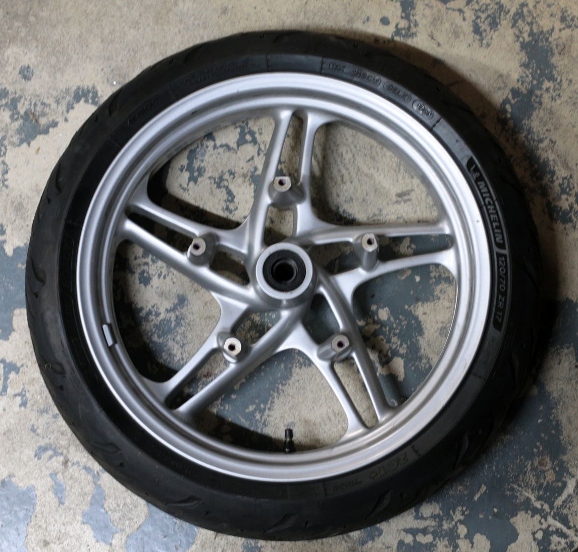 Excellent condition five-spoke front wheel for all R1100S ABS models built up to 1/2001 and K1200RS ABS bikes built up to 12/00. Has only very, minor scratches, straight and true. Has a Michelin Road 6 tire with about 60% tread remaining.
