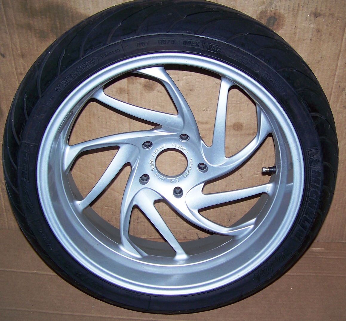 Very good condition Silver 6 X 17 rear wheel for all K1200/1300S bikes. Will work for a K1200/1300R and K1200/1300GT also, straight and true. Has a nice Michelin Pilot Road 3 tire 180/50 X 17 tire with 60-70% tread remaining. This wheel is over $1000 new, save big here!