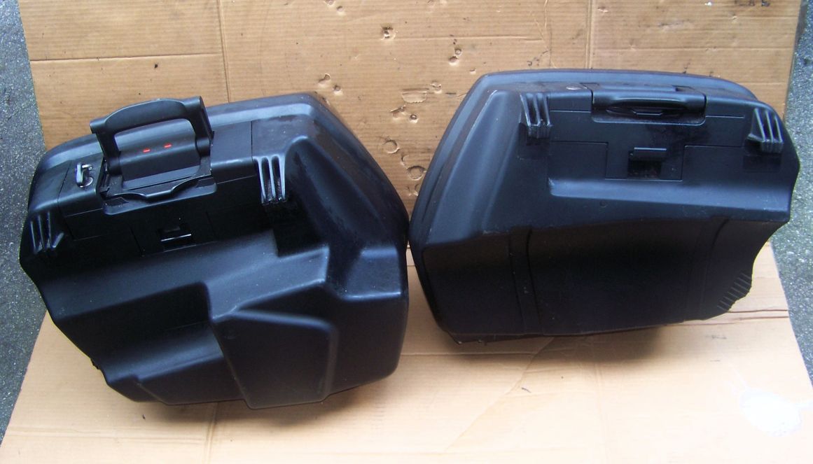 Very good condition left and right side System cases with lock cylinders and key. These have the standard lids with the gloss black finish. There are a few minor but noticeable scratches and scuffs. This is the set with the smaller left side bag with the cutout for the high R/GS exhaust.