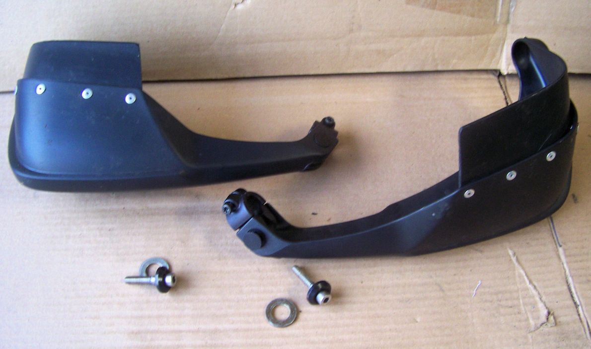 Good usable condition set of hand guards with mounting clamps for all R1150GS bikes. The guards have spoilers riveted on the top edges for extra wind protection. Can also be fitted to R1150R bikes.