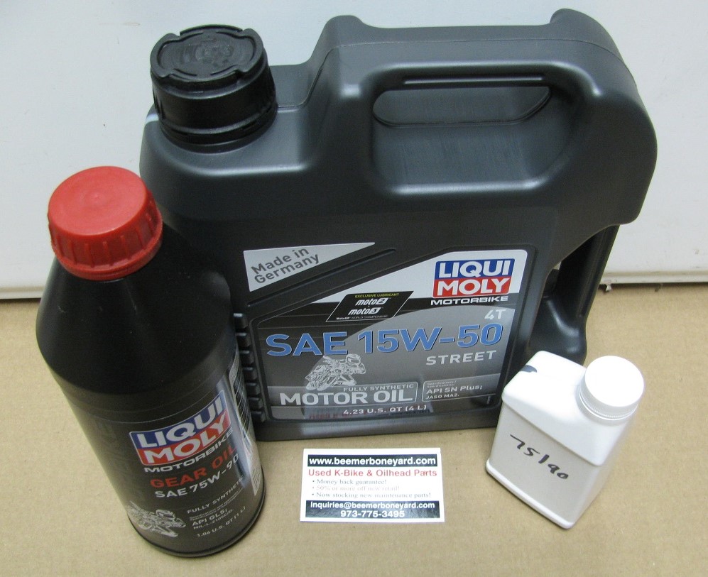 Complete new maintenance kit for all K1200LT/RS and K1200GT (GT up to 2005 only) bikes. Includes a Mann air filter & Mann fuel filter,Bosch oil filter with crush washer, oil filter door O-ring, oil filler plug O-ring, 2 fuel line hose clamps, transmission and final drive crush washer set, 2 extra Viton O-rings for the fuel line disconnects, and 4 NGK DCPR7E spark plugs - (Bosch has discontinued the XR7LDC spark plugs). Also includes a 4 liter jug of high quality German Liqui-Moly Street 4T Synth 15W-50 engine oil and 1.25 liters of Liqui-Moly 75W90 Synthetic gear oil. This is the fully synthetic engine oil with API-SN+ JASO MA2 rating and the fully synthetic 75W90 gear oil (GL-5 rating). This is enough for 1 engine oil change on you K-bike with about a little left over for topping up and 1 trans and final drive oil change. New these parts total nearly $250, save big here! Please note: Liqui-Moly has changed their packaging on their gear oil from 500ML bottle to 1000ML bottles. This kit now contains 1.25 liters of gear oil.